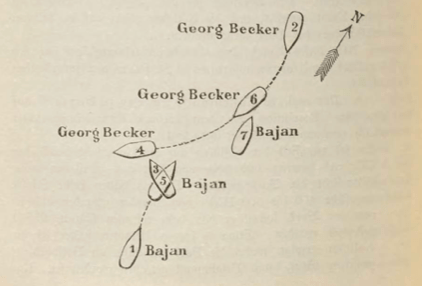 No. 3, der „Bajan“ mit dem Ruder Backbord kollidirt mit dem „Georg Becker“;